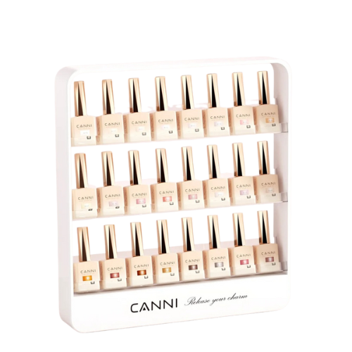 L'étagère est spécialement conçue pour accueillir le Kit CANNI VIP complet ainsi que vos autres vernis semi-permanents et gels UV/LED. La capacité dépend de la taille de vos flacons.